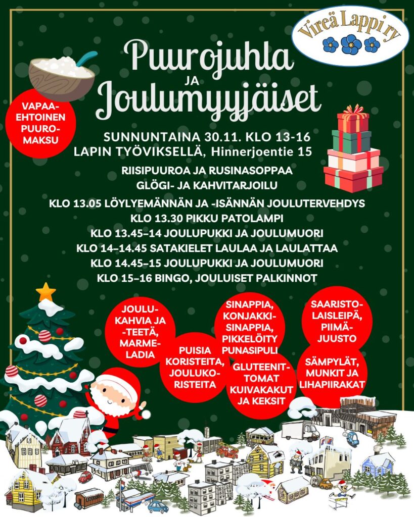 Vireä Lappi ry järjestää jälleen Puurojuhlan ja joulumyyjäiset, jotka tuovat kylälle mukavan annoksen joulun odotusta ja hyvää mieltä. Tapahtuma on kaikille avoin ja tarjoaa tekemistä ja nähtävää koko iltapäiväksi.